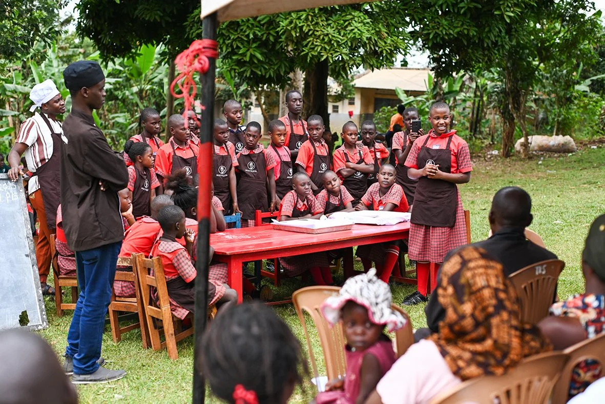 “Everything is locally available,” Bonny tells the children as our trainer shares what he just learned: extracting cassava starch and mixing it with garlic, ginger, and turmeric to make a natural Royco. All of these ingredients every one of these children can grow them in their gardens – plus, there is a huge market demand. No-one here cooks without Royco!